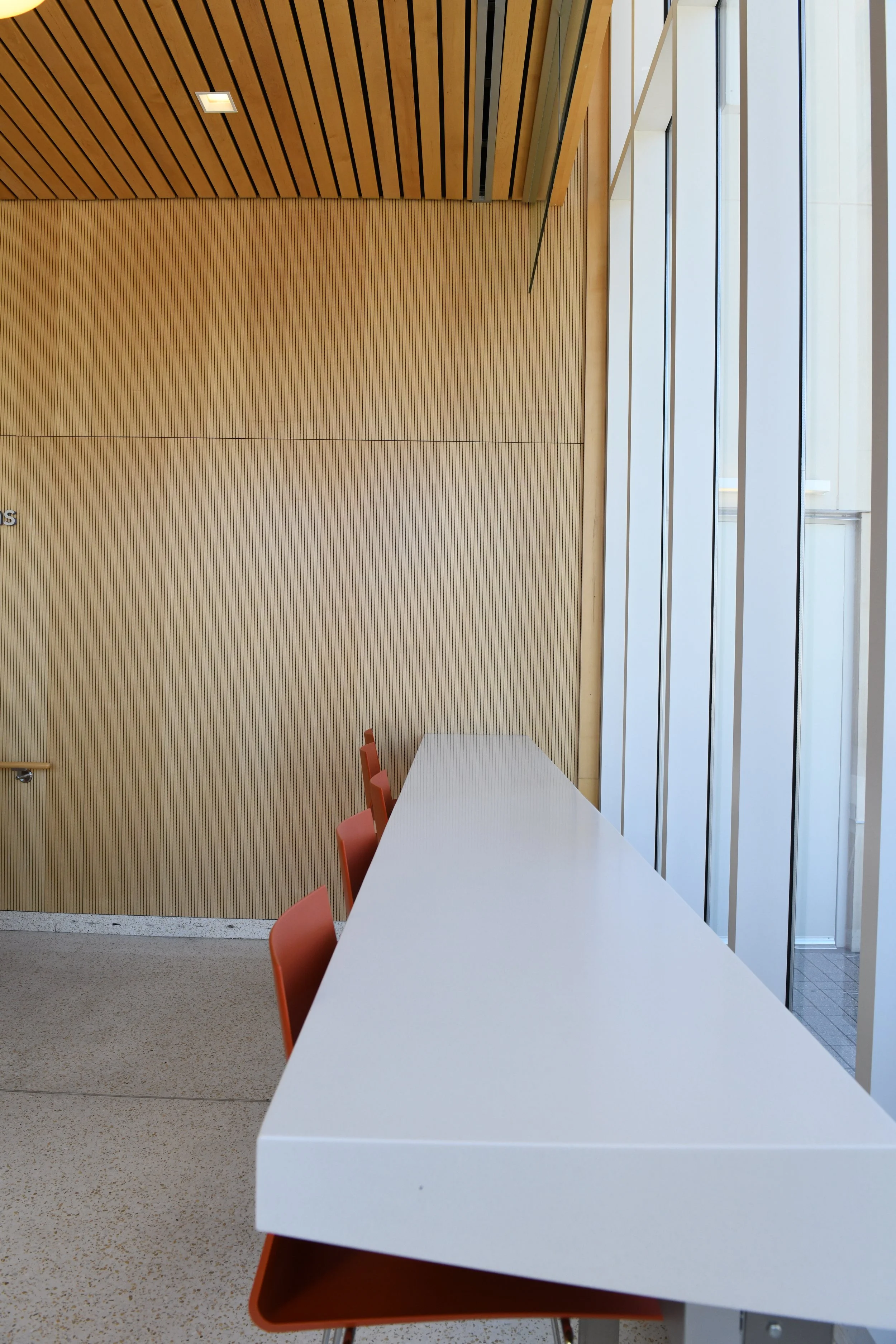 The Academic Café at Salisbury University immediately caught my eye as the perfect subject for my assignment. I was drawn to the contrast between the warm wood wall accents and the bright orange chairs and lighting. The space offered a variety of angles and strong composition opportunities for architectural photography.